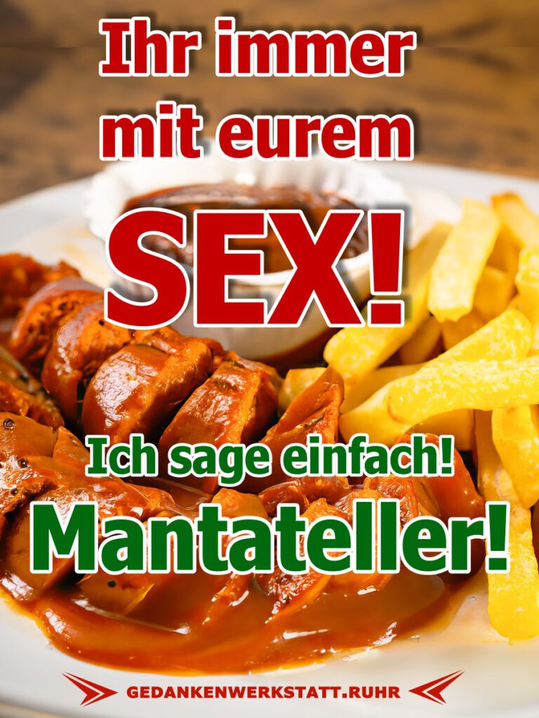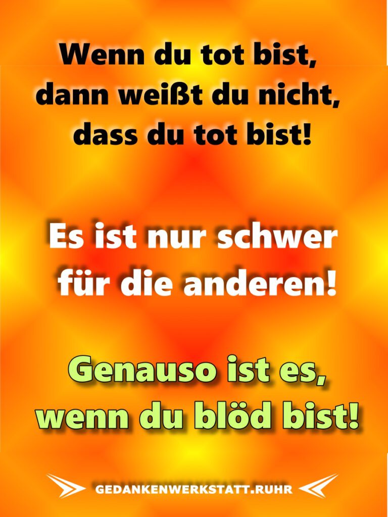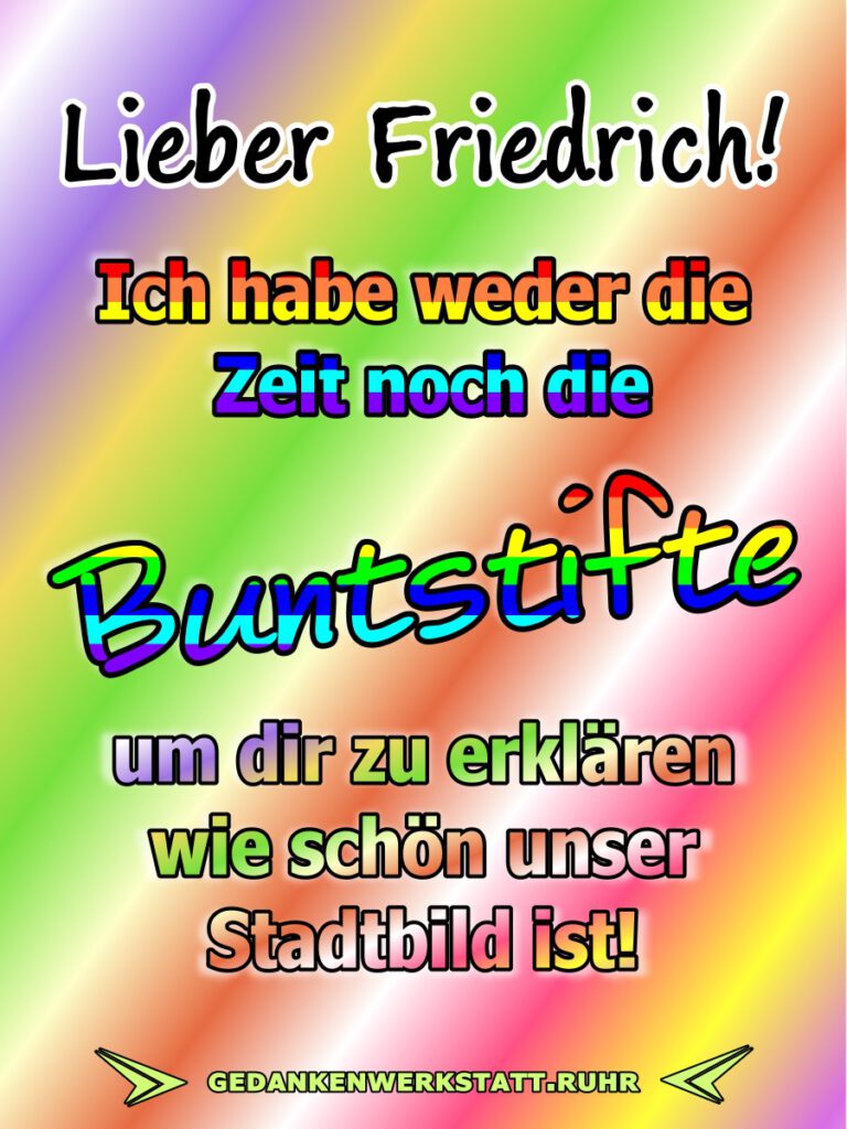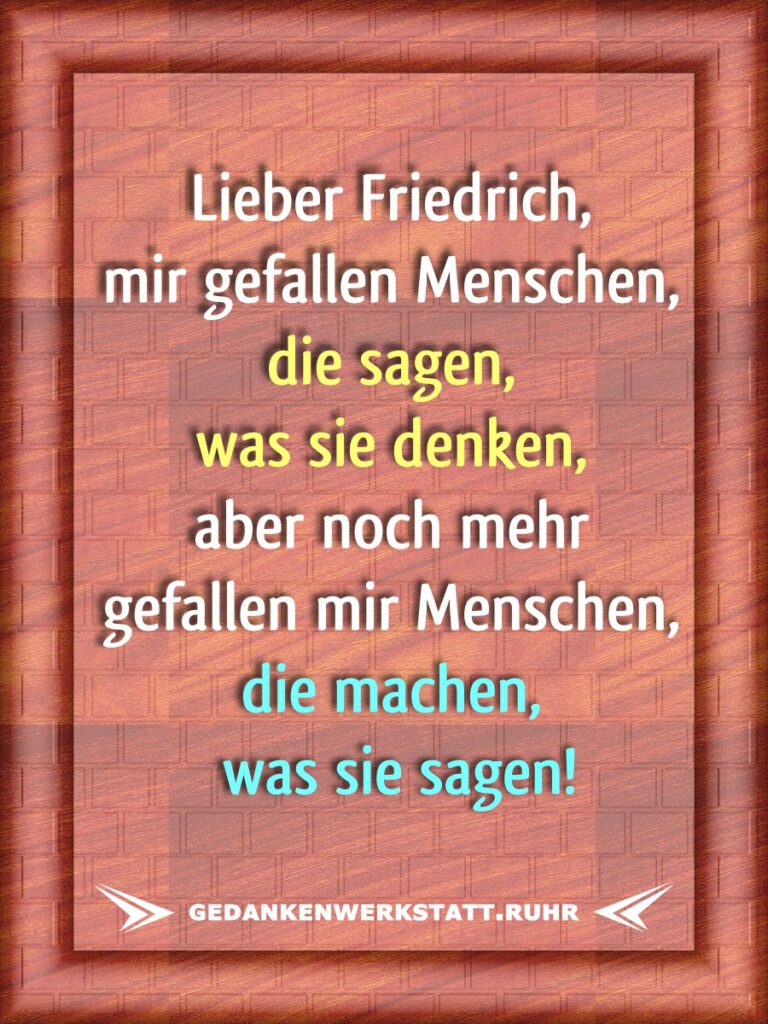 Die Gedanken sind frei! – Seite 11 Lieber Friedrich! Ich habe weder die Zeit noch die Buntstifte um dir zu erklären wie schön unser Stadtbild ist! Ihr immer mit euerem Sex! Ich sage einfach Mantateller! Lieber Friedrich! Mir gefallen Menschen die sagen was sie denken, aber noch mehr gefallen mir Menschen, die machen was sie sagen! Wenn du tot bist, dann weißt du nicht, dass du tot bist! Wir werden nicht durch die Erinnerung an unsere Vergangenheit weise, sondern durch die Verantwortung für unsere Zukunft. Karotten verbessern die Sehkraft. Leg dich nicht mit Zucker an. Er ist raffiniert! Wer glücklich sein will, muss bei Sturm und Regen tanzen, statt auf die Sonne zu warten. Alle möchten lange leben, aber keine will alt werden.