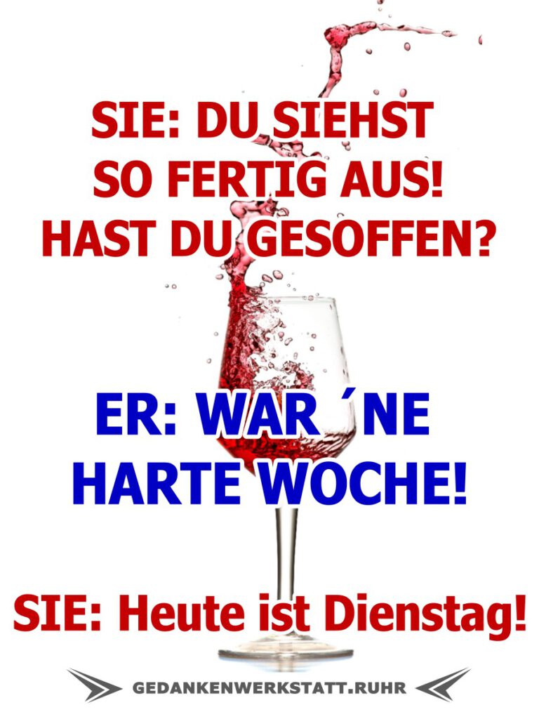 Die Gedanken sind frei! – Seite 6 Mit KNÖTLI im DÖDLI ist VÖGLI unmögli! Manche Menschen sind wie Wolken. Wenn sie gehen scheint wieder die Sonne! Hätten Lügen kurze Beine, dann hätten Politiker Hornhaut am Sack! Alte Freunde sterben, neue Freunde erscheinen. Es ist wie mit den Tagen. Ein alter Tag geht und ein neuer erscheint. Spruch von Dalei Lama. ER: Ich langweile mich. SIE: Mich auch. Menschen sind wie Bücher. Manche täuschen mit dem Umschlag. Andere überraschen mit dem Inhalt. Die Sprache des Ruhrpotts 🙂 kann man nicht übersetzen. KARL: Gestern habe ich mein erstes graues Schamhaar entdeckt! FRITZ: Sind die deshalb im Fahrstuhl so ausgerastet? SIE: Du siehst so fertig aus! Hast du gesoffen? ER: War halt eine harte Woche! SIE: Heute ist Dienstag!